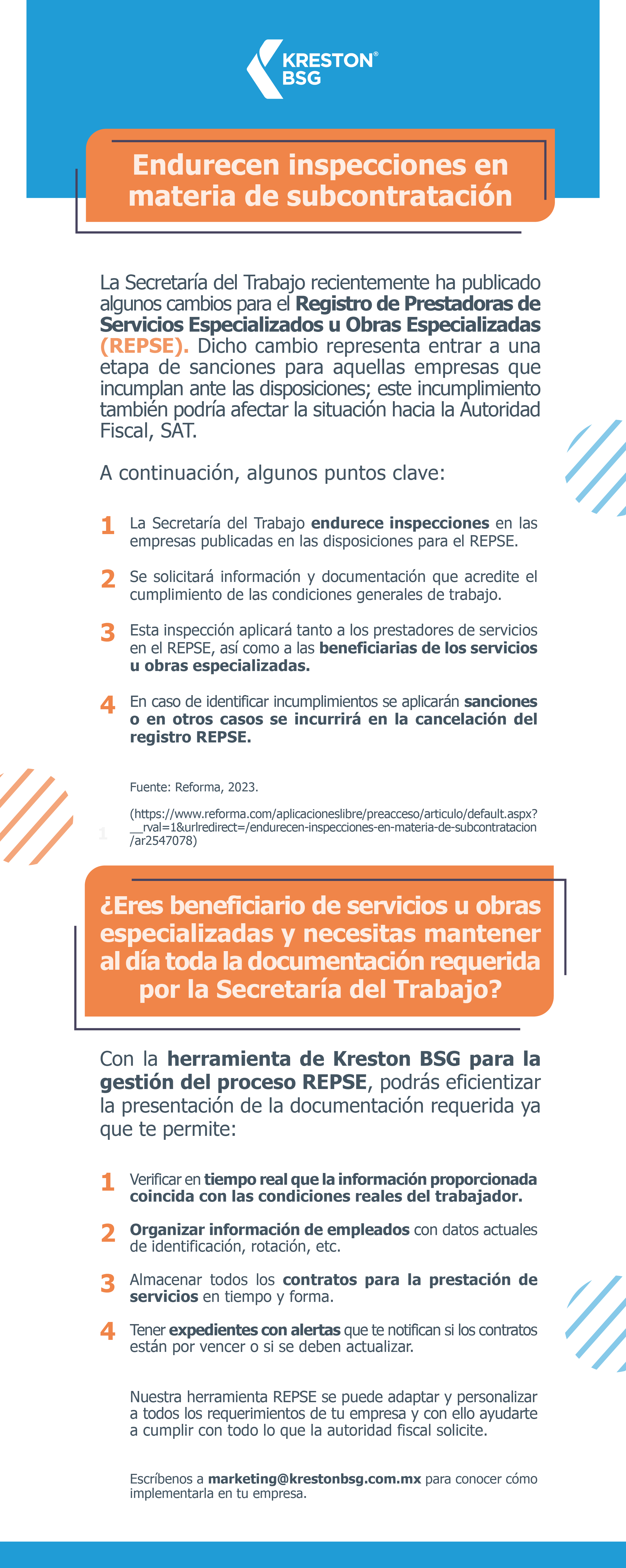 Con la herramienta de Kreston BSG para la gestión del proceso REPSE, podrás eficientizar la presentación de la documentación requerida y evitar sanciones en materia de subcontratación, ya que te permite: