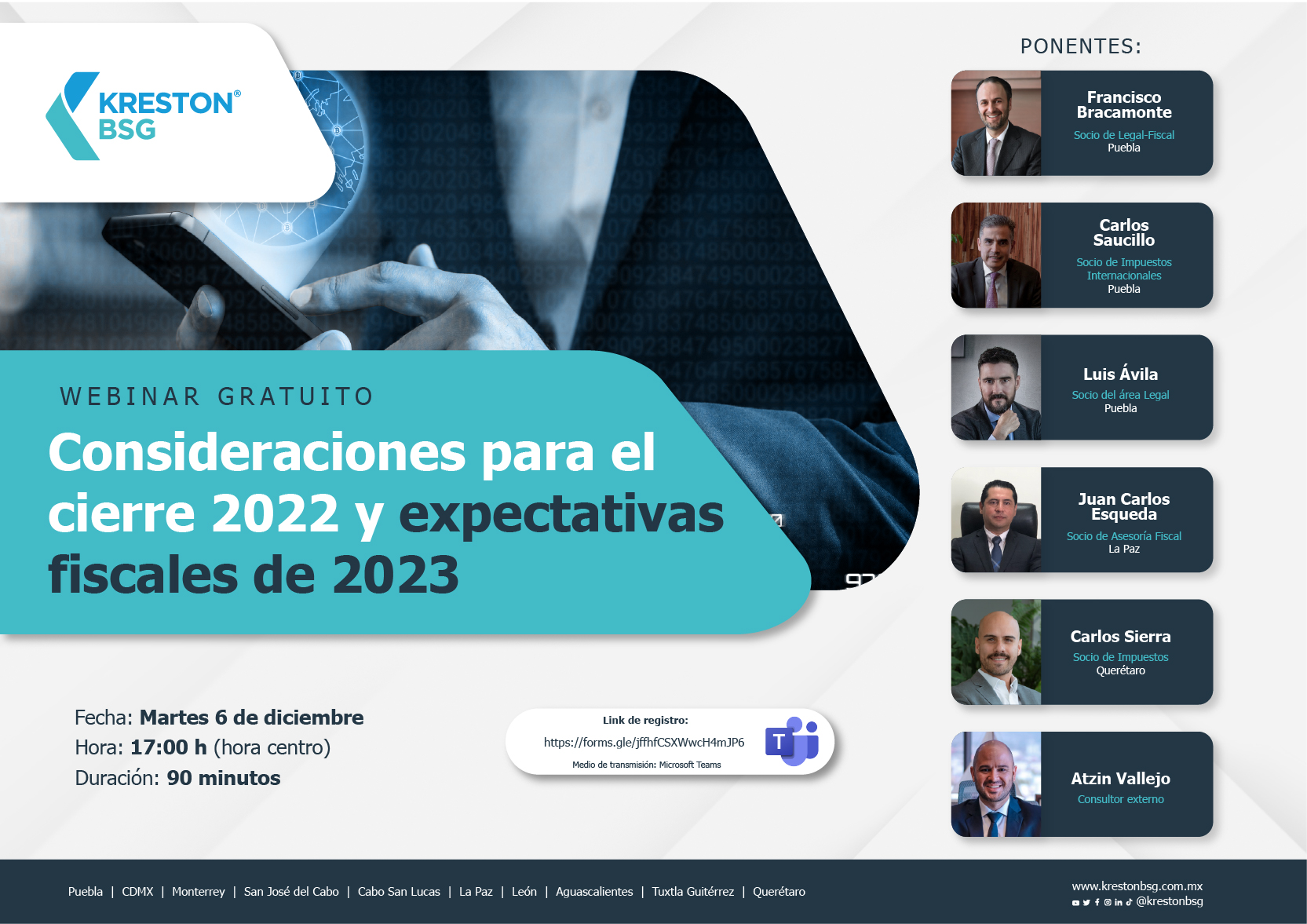Algunos de los temas que nuestros expertos expondrán en el Webinar: Consideraciones del cierre 2022 y expectativas fiscales 2023 son: